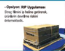Rip Ünitesi: Streç filmini ip haline getirerek, palet etrafında yatay bir çember vazifesi görür, yüklerin bir arada kalmasını sağlar.
